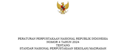 PERPUSTAKAAN NASIONAL RI. (2024). PERATURAN PERPUSTAKAAN NASIONAL REPUBLIK INDONESIA NOMOR 4 TAHUN 2024 TENTANG STANDAR NASIONAL PERPUSTAKAAN SEKOLAH/MADRASAH. Retrieved from Peraturan BPK: https://peraturan.bpk.go.id/Details/297048/peraturan-perpusnas-no-4-tahun-2024